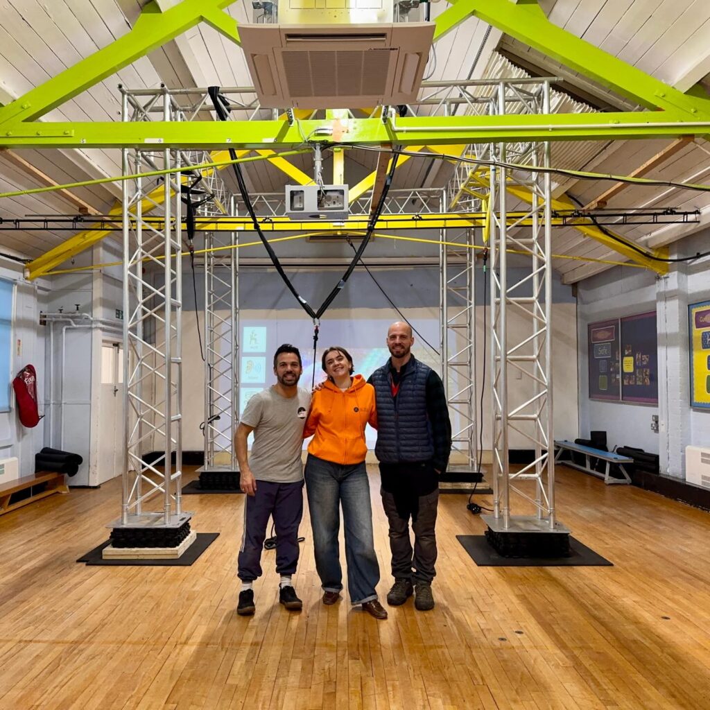 Last month we delivered a high-school workshop with 42 children and young people, transforming the school gym into an aerial playground. Using a newly adapted low-cost, low-fly rig, students explored harness work, swinging, core strength, teamwork, and creative movement – from their very first lift-off to working in tandem, one on the ground and one in the air, creating shapes and pathways they wouldn’t normally have access to.